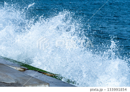 波が砕けて生まれる水しぶきの力強い瞬間