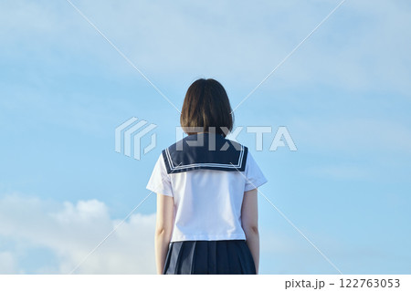 青空と海を背景に立つ女子高校生