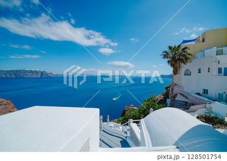 ギリシャのサントリーニ島イアにて、青空と青い海