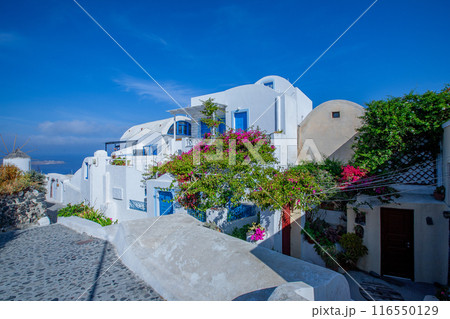 ギリシャサントリーニ島イア 高級ホテル近くのエーゲ海へ続く道