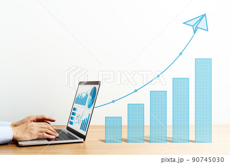 ビジネスの成長を分析するためにノートパソコンを使う男性。青いグラフとノートパソコン。