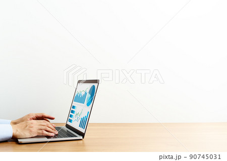 分析のためにノートパソコンを使う男性の俯瞰。青いグラフとノートパソコン。