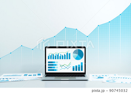 ビジネスデータと成長の分析。ノートパソコンとレポート。パソコン画面に青いグラフ。