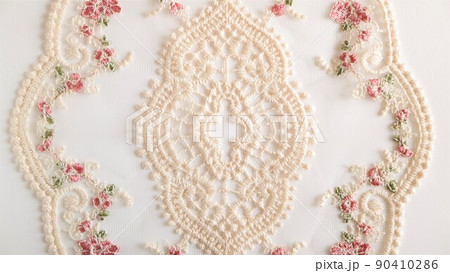 花がらのレースの素材 白背景 赤い小花のレース アンティークレース
