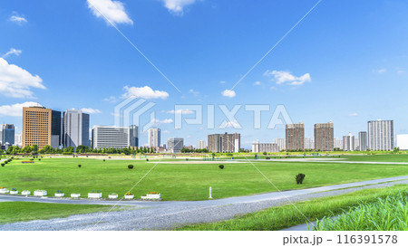 多摩川緑地と川崎駅前のビル群のパノラマ風景【神奈川県・川崎市-東京都・大田区】