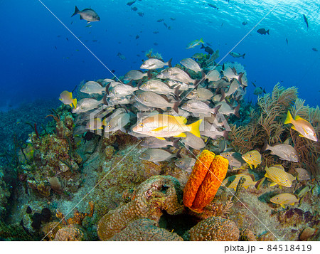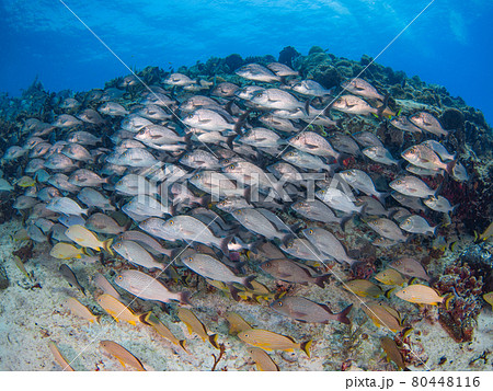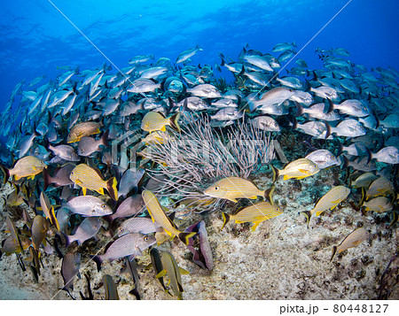 珊瑚礁に群れるセーラーズグラント(イサキの仲間) (プラヤ・デル・カルメン、メキシコ)