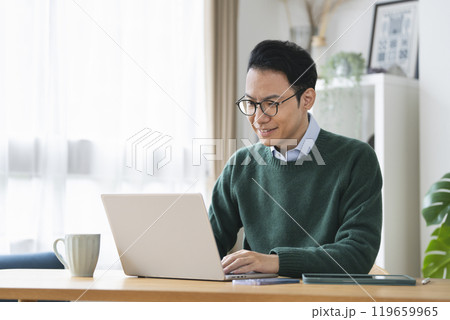 ノートパソコンで作業をする30代後半の男性 在宅ワーク イメージ