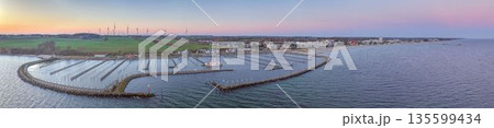 Aerial panorama of Groemitz marina and coastline at sunset