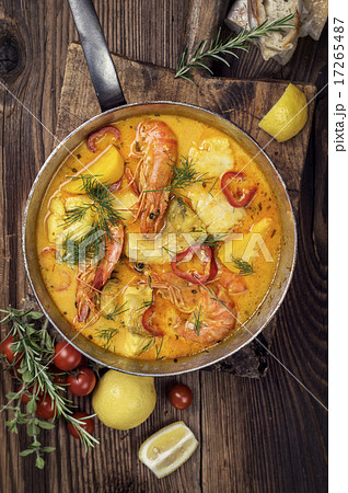 Traditional French fish soup with prawns and mussels