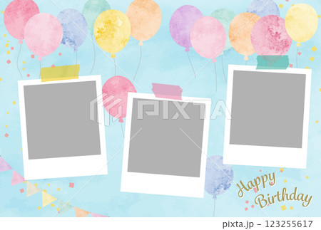 写真フレーム水彩の風船背景バースデーカードイラスト