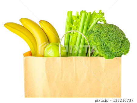 Paper grocery bag with fresh fruits and vegetables isolated on white background
