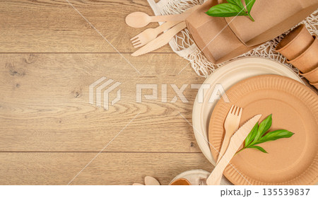 Eco friendly disposable tableware with wooden cutlery and paper plates on wooden background with copy space