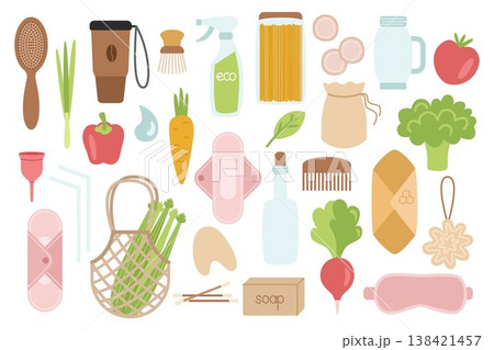 Zero-waste lifestyle. Reusable household items, eco-friendly hygiene products and household supplies, natural food and sustainable alternatives for everyday life. Flat vector illustration.