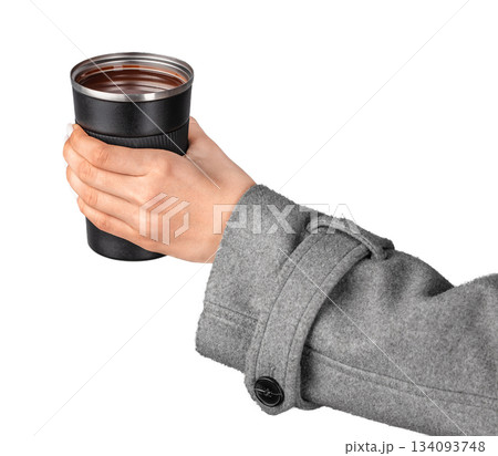 Hot chocolate. Hand holding reusable travel cup with hot drink isolated on white background with copy space