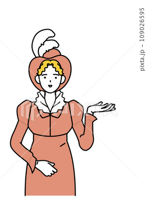 赤い薔薇をモチーフにしたドレスの羽飾りのついた帽子を被った女性の後ろ姿