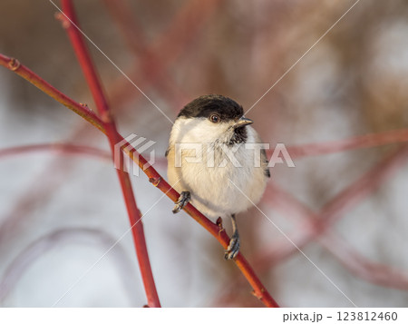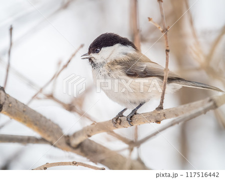 Cute bird The willow tit, song bird sitting on a branch without leaves in the winter.