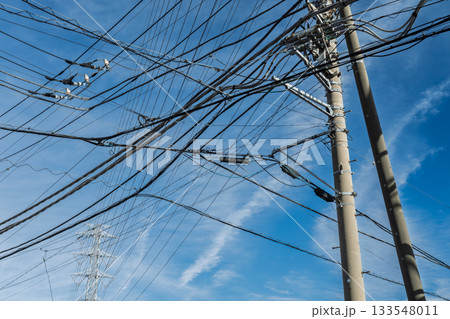 交差する高圧送電線と住宅街の電線と夏の空 ライトカラー