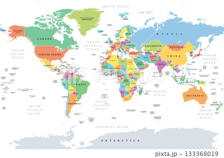 Countries of the world, multi colored political map, with international borders, main oceans, largest lakes and seas. Cylindrical projection. English labeling. Isolated illustration over white. Vector