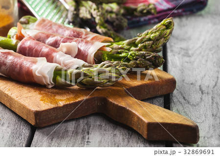 Asparagus wrapped in prosciutto .