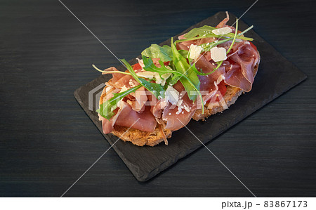 bruschetta with prosciutto and cream cheese on black plate on conctere background