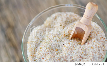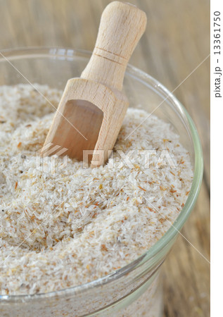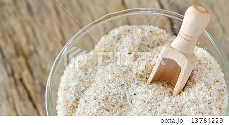 Psyllium husk in wood bowl with spoon on linen table cloth background, top view, copy space