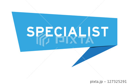 Blue color speech banner with word specialist on white background