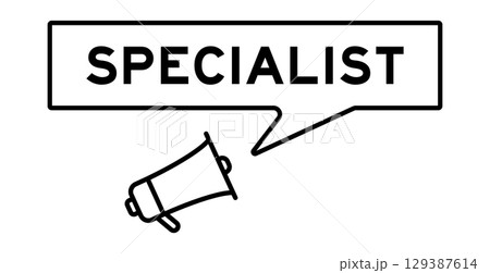 Color megaphone icon with word specialist in white banner on blue background