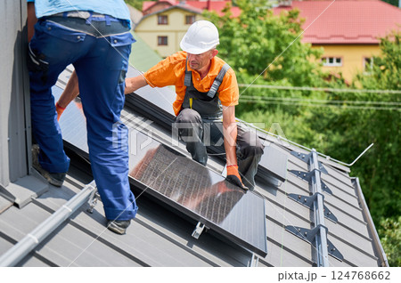 Workers building solar panel system on metal rooftop of house. Two men installers installing photovoltaic solar module outdoors. Alternative, green and renewable energy generation concept.