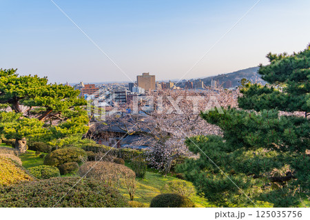 (石川県)桜が咲いた兼六園から見る金沢の街