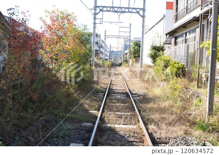 住宅街の路面電車の曲がりくねったレールの線路の風景