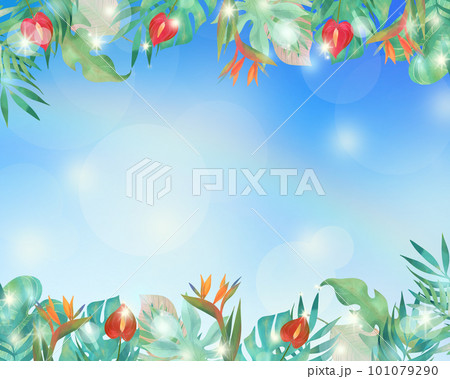 美しい海とヤシの葉と赤の花ー虹ー極楽鳥花ー夏のおしゃれフレーム背景素材