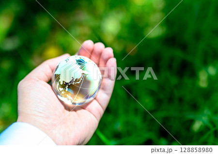 綺麗な新緑に上からかざす地球儀の水晶 エコロジーイメージ 虹色