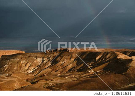 Dramatic rainbow over desert landscape with storm clouds and sea view