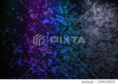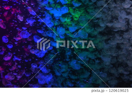 虹色にライトアップされたミズクラゲの大群