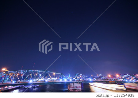 タイ王国バンコク、ラマ1世橋(メモリアル・ブリッジ)から見たチャオプラヤー川の夕景、サンセット
