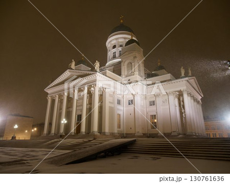 Majestic Helsinki Cathedral rises against the bright sky, showcasing its iconic columns and architecture.