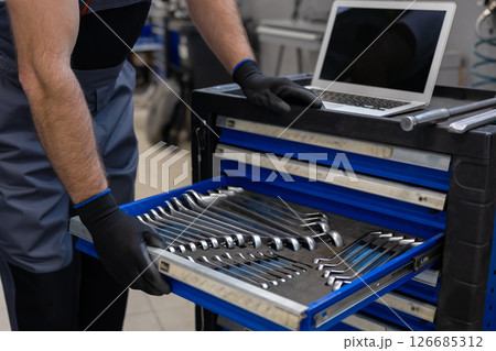 Electronics adjustment, with digital tablet. Mechanic working in a car service station