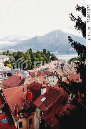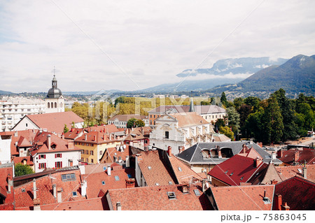 Annecy city top view, lake in the distance. Tile roofs, Cathedral