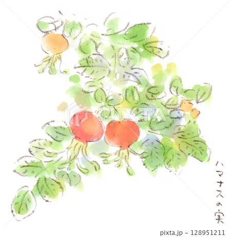 夏の植物、オレンジ色の不思議な形、ハマナスの実の水彩画イラスト