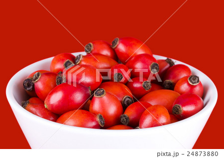 Fresh rose hips in a white bowl on linen. Also rose haw or rose hep, intense red ripe fruits, used for herbal teas, jam and can be eaten raw. One of the richest vitamin C sources available in plants.