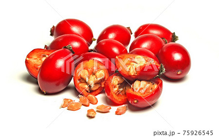 Rosehips Rosa Canina fruits , some cut in half seeds visible, isolated on white background.