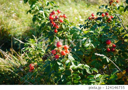 Briar, wild rose hip shrub in nature. Landscape of late autumn. Dog rose, bunch branch Rosehips, Different types Rosa canina hips.