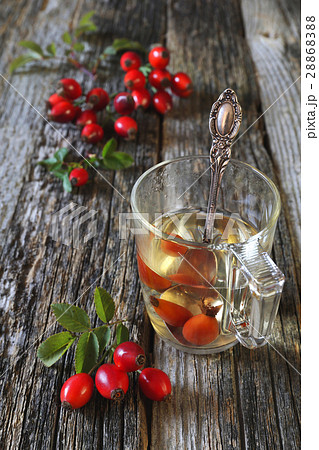 A cup of rose hip tea with fresh berries in a glass cup on dark wood background. Vintage background, selective focus