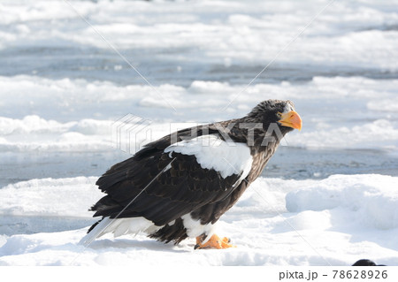 積雪の流氷上に下りたオオワシ(成鳥)