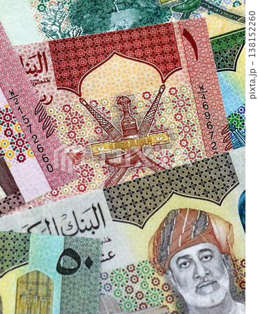 Omani rial paper banknotes pile on table. Oman OMR currency money bills in big amount. Concept of economics, taxation and banking in Oman