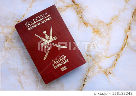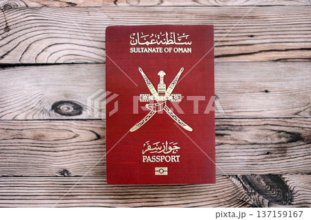 Omani passport on table close up. Official identification document book for citizens of Oman. Concept of travel and tourism