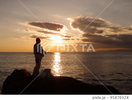 相模湾に落ちる夕陽、夕まずめ時を狙い続ける磯にたつクロダイ釣り人のシルエット。
