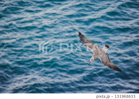 Juvenile seagull soaring gracefully above the blue ocean waters, wings fully extended while gliding in mid-air over the sea surface.