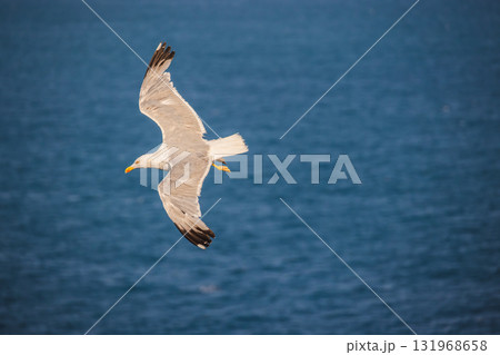 A seagull glides gracefully in the sky above the calm blue ocean, wings spread wide in mid-flight.