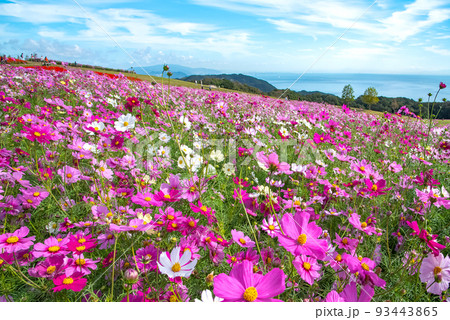 青空に映える満開のコスモス畑とサルビア 淡路花さじき